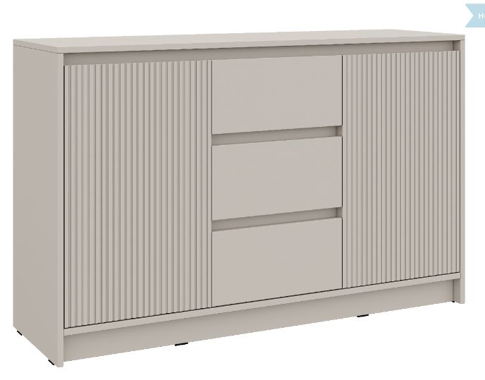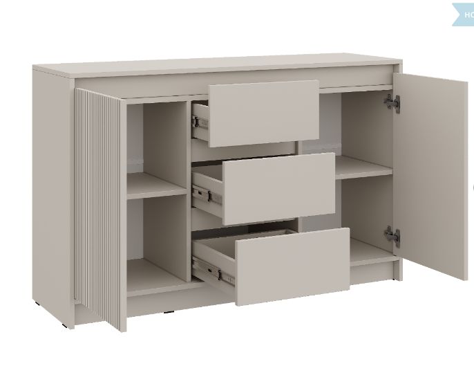 МИРЕН Комод КМ-003 визуально состоит из 3х частей: створок слева и справа, и 3х ящиков в